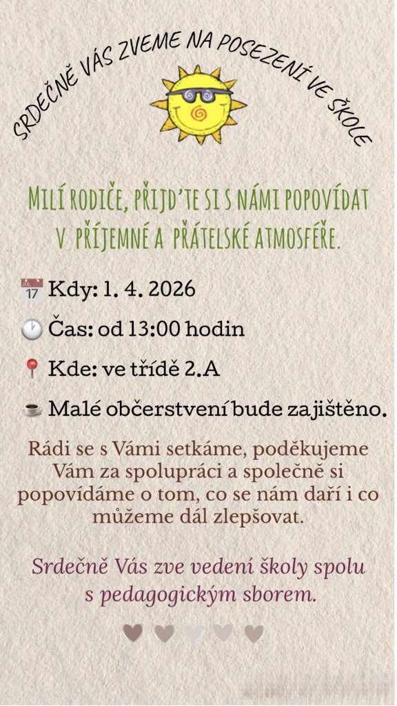 přijďte si s námi popovídat v příjemné a přátelské atmosféře dne 1.4.2026 od 13 hodin ve třídě 2.A